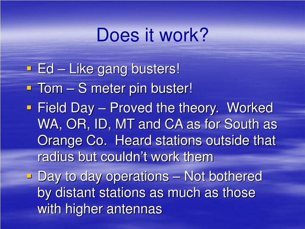 Does it work? • Ed – Like gang busters! • Tom – S meter pin buster! • Field Day – Proved the theory. Worked WA, OR, ID, MT and CA as for South as Orange Co. Heard stations outside that radius but couldn’t work them • Day to day operations – Not bothered by distant stations as much as those with higher antennas