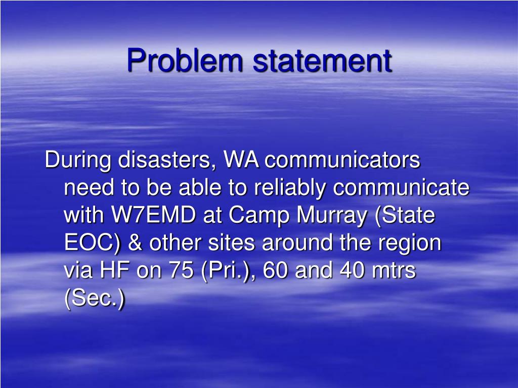 Problem statement During disasters, WA communicators need to be able to reliably communicate with W7EMD at Camp Murray (State EOC) & other sites around the region via HF on 75 (Pri.), 60 and 40 mtrs (Sec.)
