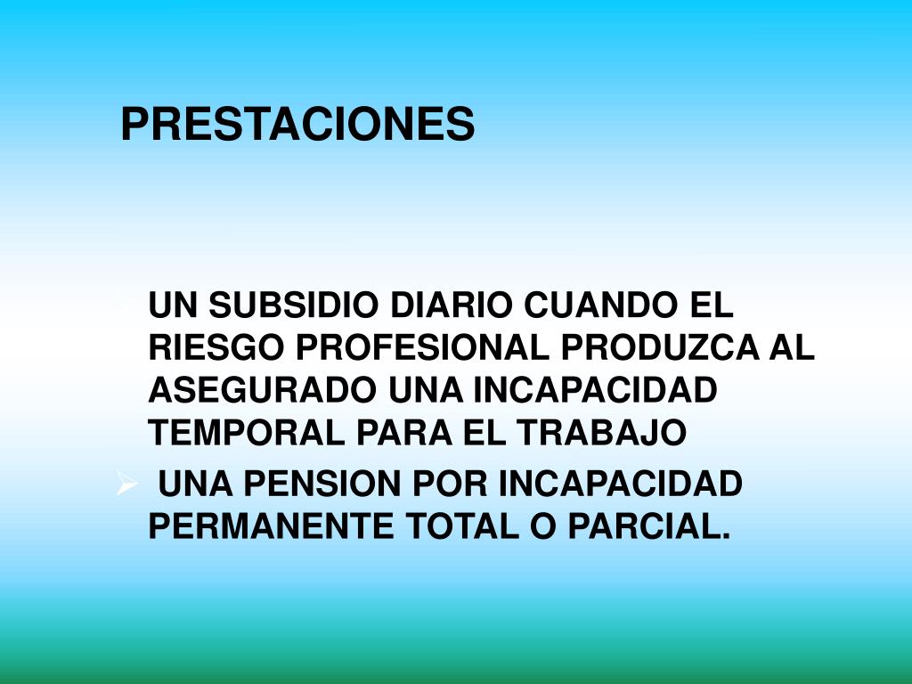 PRESTACIONES • UN SUBSIDIO DIARIO CUANDO EL RIESGO PROFESIONAL PRODUZCA AL ASEGURADO UNA INCAPACIDAD TEMPORAL PARA EL TRABAJO • UNA PENSION POR INCAPACIDAD PERMANENTE TOTAL O PARCIAL.