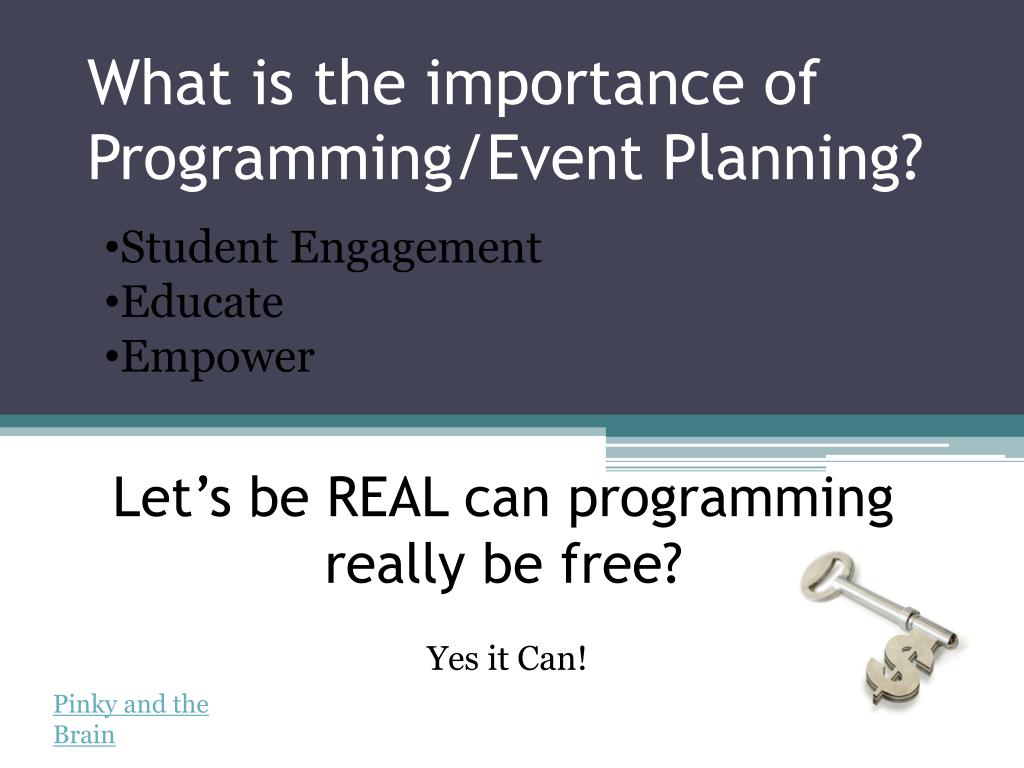 Student Engagement • Educate • Empower What is the importance of Programming/Event Planning? Yes it Can! Let’s be REAL can programming really be free? Pinky and the Brain