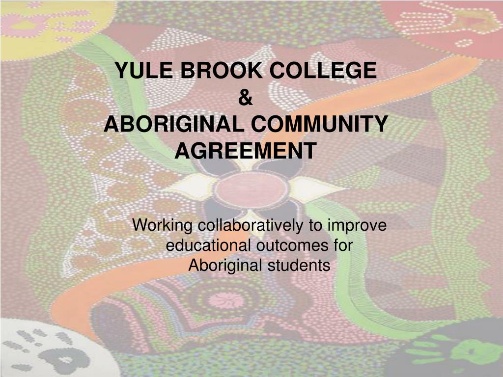 YULE BROOK COLLEGE & ABORIGINAL COMMUNITY AGREEMENT. Working collaboratively to improve educational outcomes for Aboriginal students. Basis of agreement is founded on the following understandings …. Importance of Reconciliation and Cooperation