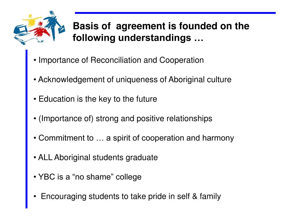 Basis of agreement is founded on the following understandings … • Importance of Reconciliation and Cooperation • Acknowledgement of uniqueness of Aboriginal culture • Education is the key to the future • (Importance of) strong and positive relationships • Commitment to … a spirit of cooperation and harmony • ALL Aboriginal students graduate • YBC is a “no shame” college • Encouraging students to take pride in self & family