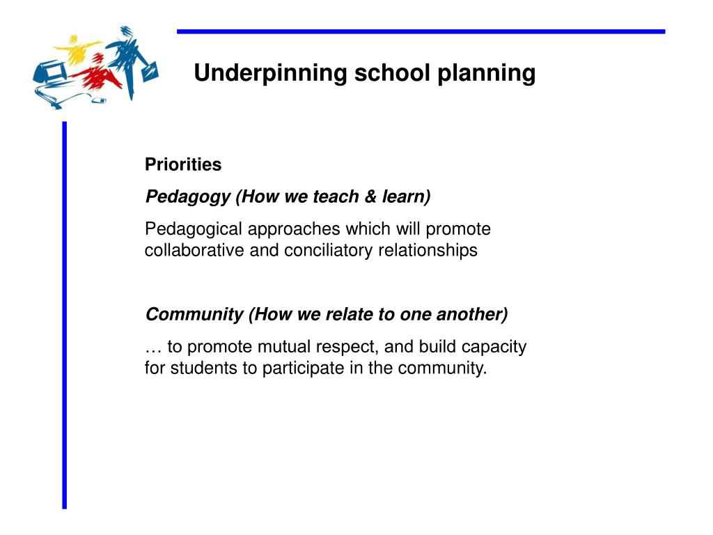 Underpinning school planning Priorities Pedagogy (How we teach & learn) Pedagogical approaches which will promote collaborative and conciliatory relationships Community (How we relate to one another) … to promote mutual respect, and build capacity for students to participate in the community.