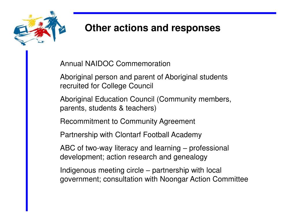 Other actions and responses Annual NAIDOC Commemoration Aboriginal person and parent of Aboriginal students recruited for College Council Aboriginal Education Council (Community members, parents, students & teachers) Recommitment to Community Agreement Partnership with Clontarf Football Academy ABC of two-way literacy and learning – professional development; action research and genealogy Indigenous meeting circle – partnership with local government; consultation with Noongar Action Committee