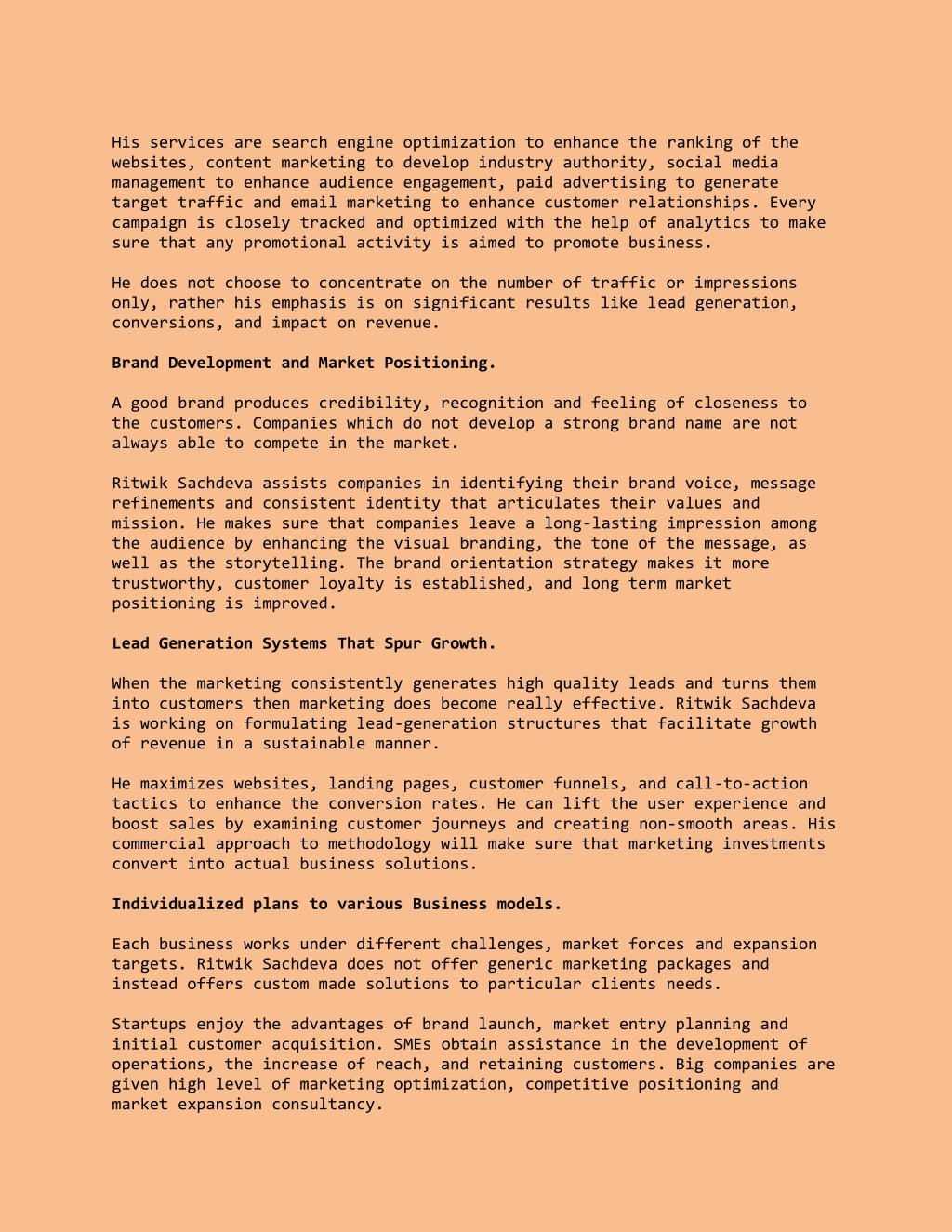 His services are search engine optimization to enhance the ranking of the websites, content marketing to develop industry authority, social media management to enhance audience engagement, paid advertising to generate target traffic and email marketing to enhance customer relationships. Every campaign is closely tracked and optimized with the help of analytics to make sure that any promotional activity is aimed to promote business. He does not choose to concentrate on the number of traffic or impressions only, rather his emphasis is on significant results like lead generation, conversions, and impact on revenue. Brand Development and Market Positioning. A good brand produces credibility, recognition and feeling of closeness to the customers. Companies which do not develop a strong brand name are not always able to compete in the market. Ritwik Sachdeva assists companies in identifying their brand voice, message refinements and consistent identity that articulates their values and mission. He makes sure that companies leave a long-lasting impression among the audience by enhancing the visual branding, the tone of the message, as well as the storytelling. The brand orientation strategy makes it more trustworthy, customer loyalty is established, and long term market positioning is improved. Lead Generation Systems That Spur Growth. When the marketing consistently generates high quality leads and turns them into customers then marketing does become really effective. Ritwik Sachdeva is working on formulating lead-generation structures that facilitate growth of revenue in a sustainable manner. He maximizes websites, landing pages, customer funnels, and call-to-action tactics to enhance the conversion rates. He can lift the user experience and boost sales by examining customer journeys and creating non-smooth areas. His commercial approach to methodology will make sure that marketing investments convert into actual business solutions. Individualized plans to various Business models. Each business works under different challenges, market forces and expansion targets. Ritwik Sachdeva does not offer generic marketing packages and instead offers custom made solutions to particular clients needs. Startups enjoy the advantages of brand launch, market entry planning and initial customer acquisition. SMEs obtain assistance in the development of operations, the increase of reach, and retaining customers. Big companies are given high level of marketing optimization, competitive positioning and market expansion consultancy.