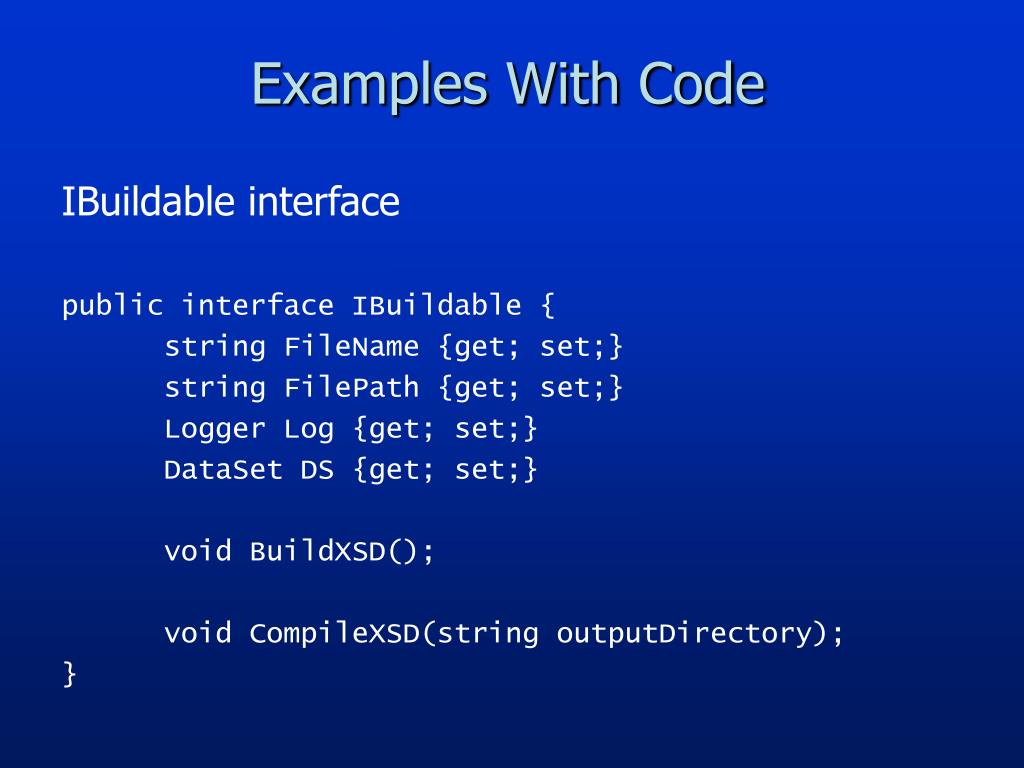 Examples With Code IBuildable interface public interface IBuildable { string FileName {get; set;} string FilePath {get; set;} Logger Log {get; set;} DataSet DS {get; set;} void BuildXSD(); void CompileXSD(string outputDirectory); }