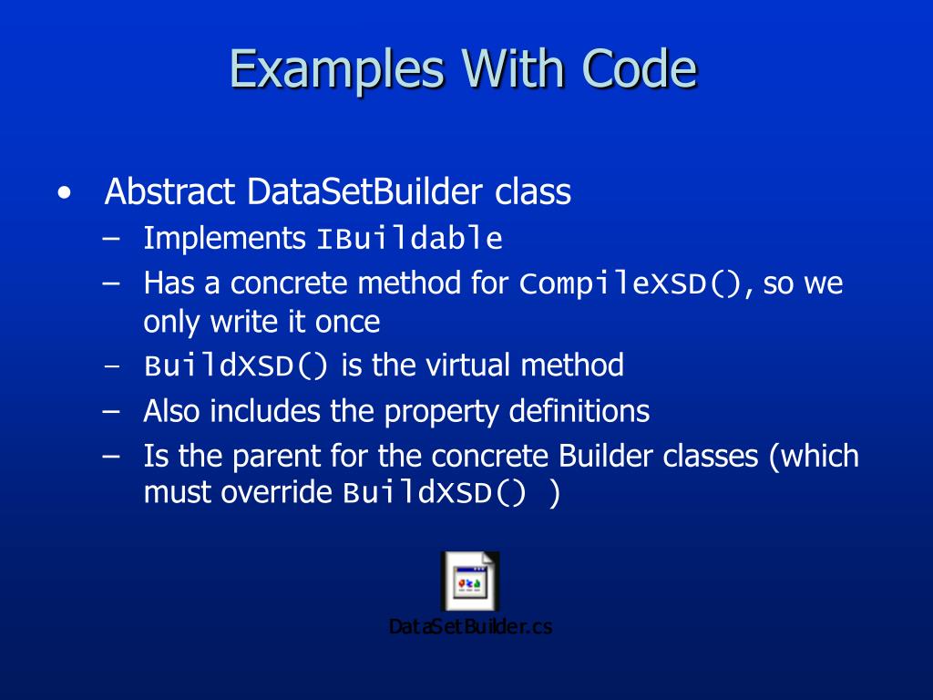 Examples With Code • Abstract DataSetBuilder class • Implements IBuildable • Has a concrete method for CompileXSD(), so we only write it once • BuildXSD() is the virtual method • Also includes the property definitions • Is the parent for the concrete Builder classes (which must override BuildXSD() )