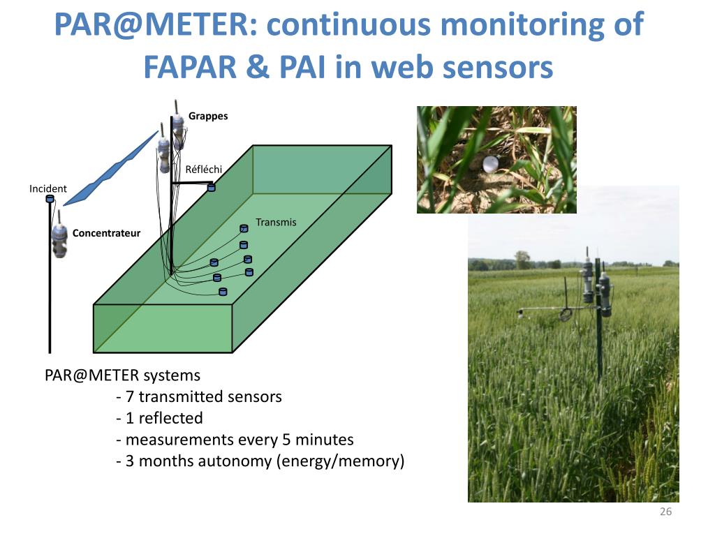 PAR@METER: continuous monitoring of FAPAR & PAI in web sensors PAR@METER systems - 7 transmitted sensors - 1 reflected - measurements every 5 minutes - 3 months autonomy (energy/memory)
