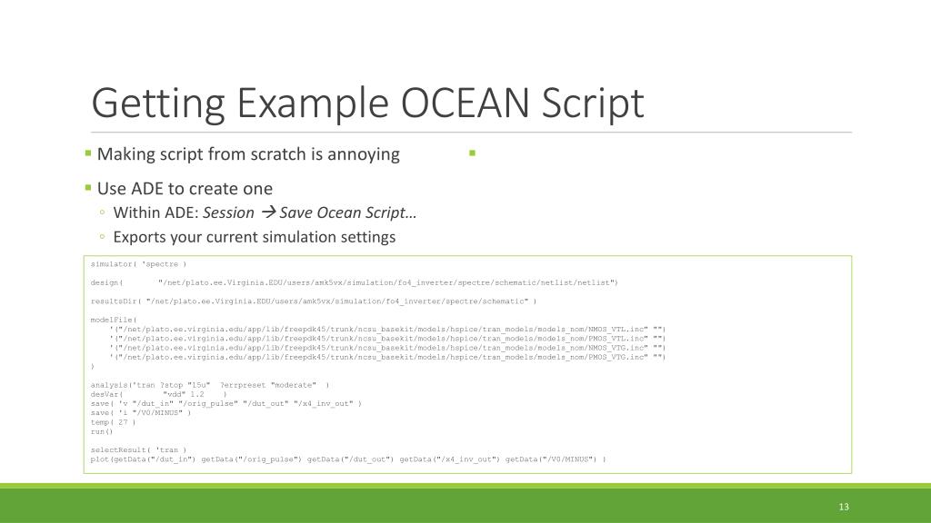 Getting Example OCEAN Script • Making script from scratch is annoying • Use ADE to create one • Within ADE: Session Save Ocean Script… • Exports your current simulation settings • simulator( 'spectre ) • design( "/net/plato.ee.Virginia.EDU/users/amk5vx/simulation/fo4_inverter/spectre/schematic/netlist/netlist") • resultsDir( "/net/plato.ee.Virginia.EDU/users/amk5vx/simulation/fo4_inverter/spectre/schematic" ) • modelFile( • '("/net/plato.ee.virginia.edu/app/lib/freepdk45/trunk/ncsu_basekit/models/hspice/tran_models/models_nom/NMOS_VTL.inc" "") • '("/net/plato.ee.virginia.edu/app/lib/freepdk45/trunk/ncsu_basekit/models/hspice/tran_models/models_nom/PMOS_VTL.inc" "") • '("/net/plato.ee.virginia.edu/app/lib/freepdk45/trunk/ncsu_basekit/models/hspice/tran_models/models_nom/NMOS_VTG.inc" "") • '("/net/plato.ee.virginia.edu/app/lib/freepdk45/trunk/ncsu_basekit/models/hspice/tran_models/models_nom/PMOS_VTG.inc" "") • ) • analysis('tran ?stop "15u" ?errpreset "moderate" ) • desVar( "vdd" 1.2 ) • save( 'v "/dut_in" "/orig_pulse" "/dut_out" "/x4_inv_out" ) • save( 'i "/V0/MINUS" ) • temp( 27 ) • run() • selectResult( 'tran ) • plot(getData("/dut_in") getData("/orig_pulse") getData("/dut_out") getData("/x4_inv_out") getData("/V0/MINUS") )