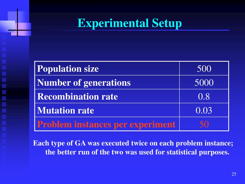 Experimental Setup Each type of GA was executed twice on each problem instance; the better run of the two was used for statistical purposes.