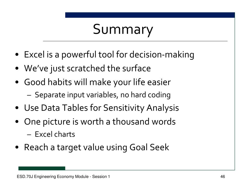 Summary • Excel is a powerful tool for decision-making • We’ve just scratched the surface • Good habits will make your life easier • Separate input variables, no hard coding • Use Data Tables for Sensitivity Analysis • One picture is worth a thousand words • Excel charts • Reach a target value using Goal Seek ESD.70J Engineering Economy Module - Session 1