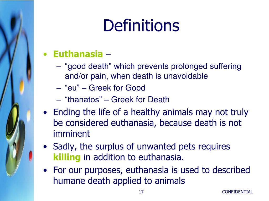 Definitions • Euthanasia – • “good death” which prevents prolonged suffering and/or pain, when death is unavoidable • “eu” – Greek for Good • “thanatos” – Greek for Death • Ending the life of a healthy animals may not truly be considered euthanasia, because death is not imminent • Sadly, the surplus of unwanted pets requires killing in addition to euthanasia. • For our purposes, euthanasia is used to described humane death applied to animals CONFIDENTIAL