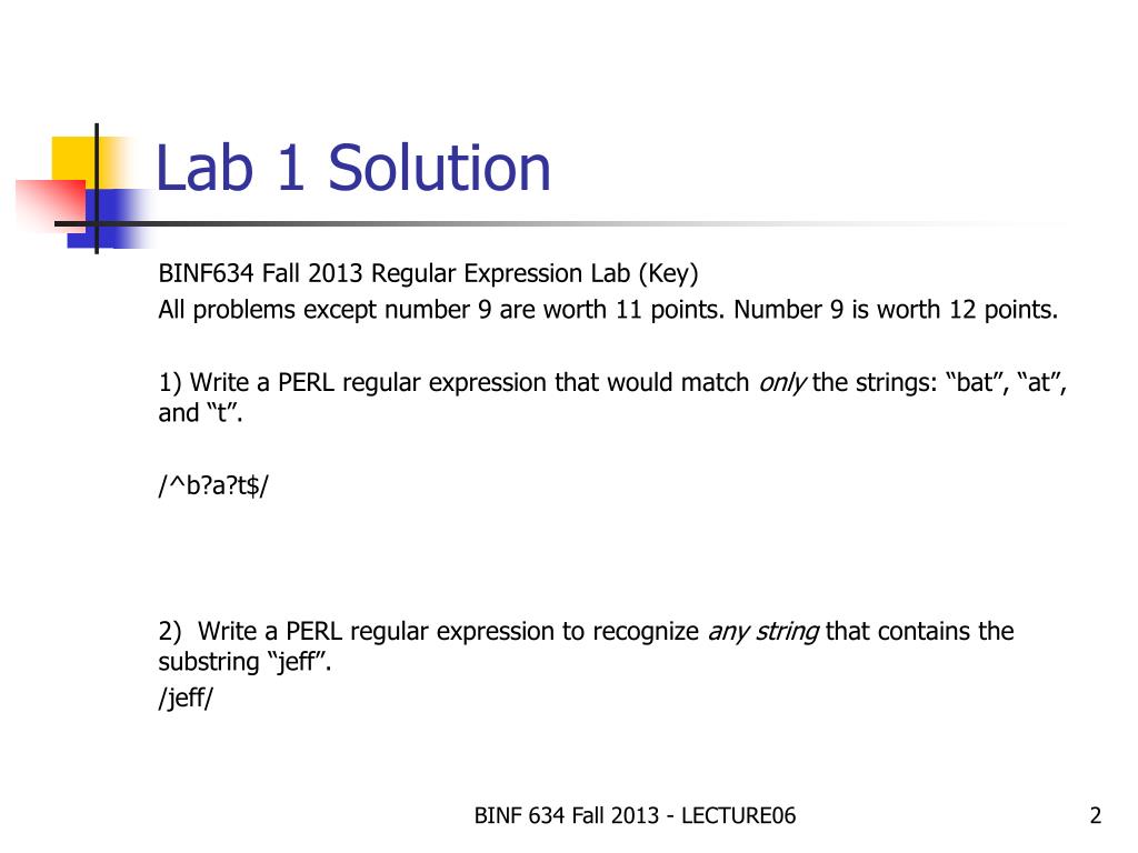 Lab 1 Solution BINF634 Fall 2013 Regular Expression Lab (Key) All problems except number 9 are worth 11 points. Number 9 is worth 12 points. 1) Write a PERL regular expression that would match only the strings: “bat”, “at”, and “t”. /^b?a?t$/ 2) Write a PERL regular expression to recognize any string that contains the substring “jeff”. /jeff/ BINF 634 Fall 2013 - LECTURE06
