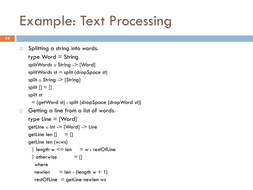 Example: Text Processing • Splitting a string into words. type Word = String splitWords :: String -> [Word] splitWordsst = split (dropSpacest) split :: String -> [String] split [] = [] split st = (getWordst) : split (dropSpace (dropWordst)) • Getting a line from a list of words. type Line = [Word] getLine :: Int -> [Word] -> Line getLinelen [] = [] getLinelen (w:ws) | length w <= len = w : restOfLine | otherwise = [] where newlen = len - (length w + 1) restOfLine = getLinenewlenws
