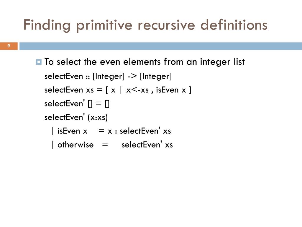 Finding primitive recursive definitions • To select the even elements from an integer list selectEven :: [Integer] -> [Integer] selectEvenxs = [ x | x<-xs , isEven x ] selectEven' [] = [] selectEven' (x:xs) | isEven x = x : selectEven' xs | otherwise = selectEven' xs