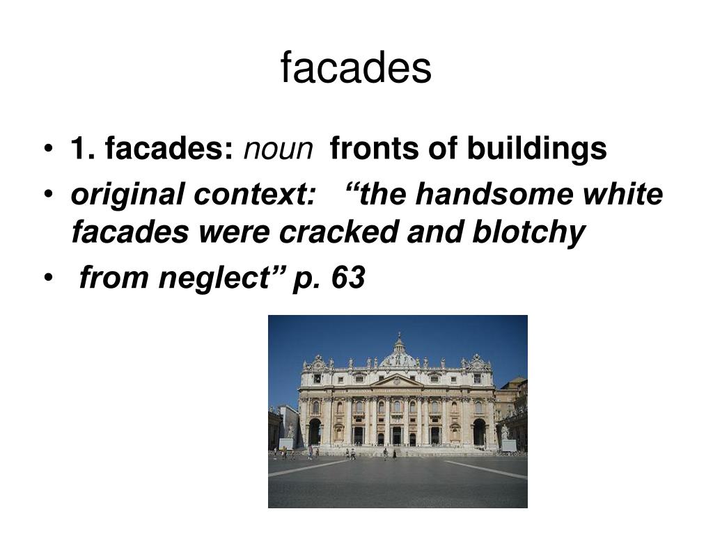 facades • 1. facades: noun fronts of buildings • original context: “the handsome white facades were cracked and blotchy • from neglect” p. 63