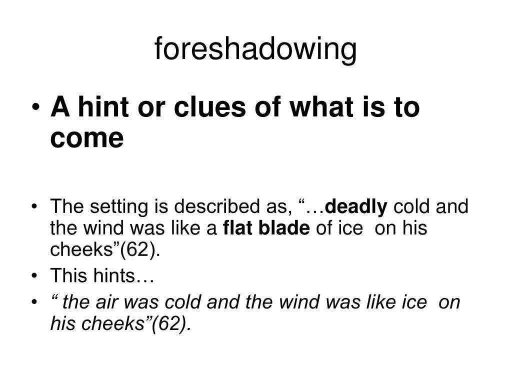 foreshadowing • A hint or clues of what is to come • The setting is described as, “…deadly cold and the wind was like a flat blade of ice on his cheeks”(62). • This hints… • “ the air was cold and the wind was like ice on his cheeks”(62).