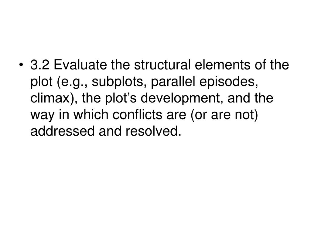 3.2 Evaluate the structural elements of the plot (e.g., subplots, parallel episodes, climax), the plot’s development, and the way in which conflicts are (or are not) addressed and resolved.