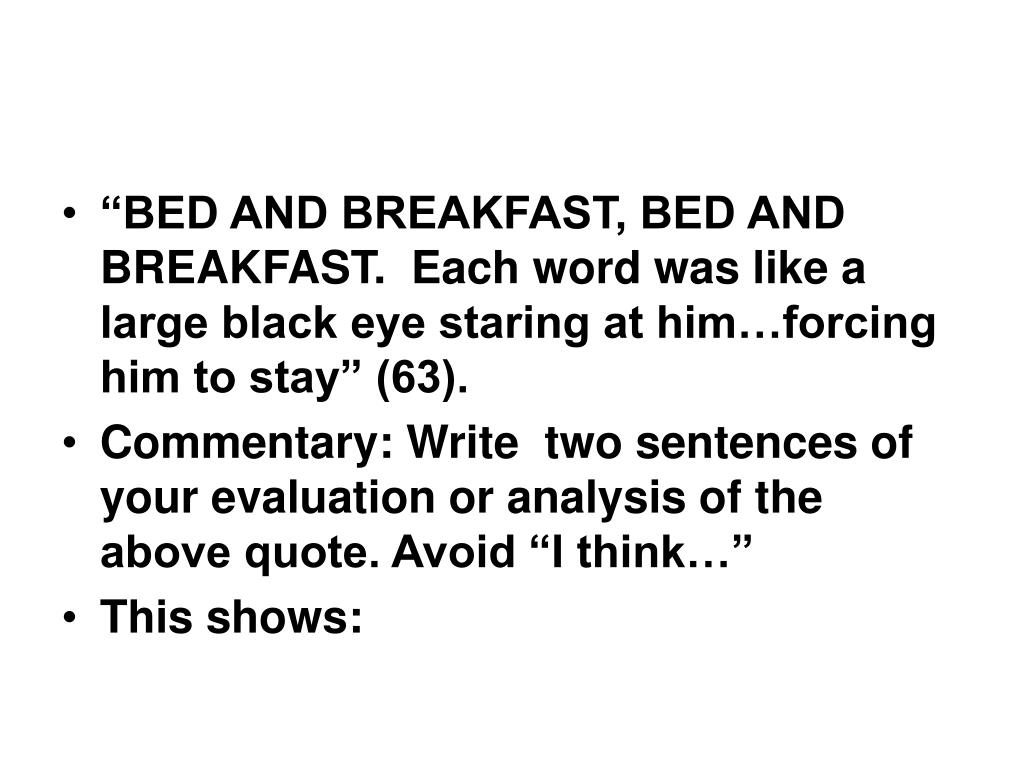 “BED AND BREAKFAST, BED AND BREAKFAST. Each word was like a large black eye staring at him…forcing him to stay” (63). • Commentary: Write two sentences of your evaluation or analysis of the above quote. Avoid “I think…” • This shows: