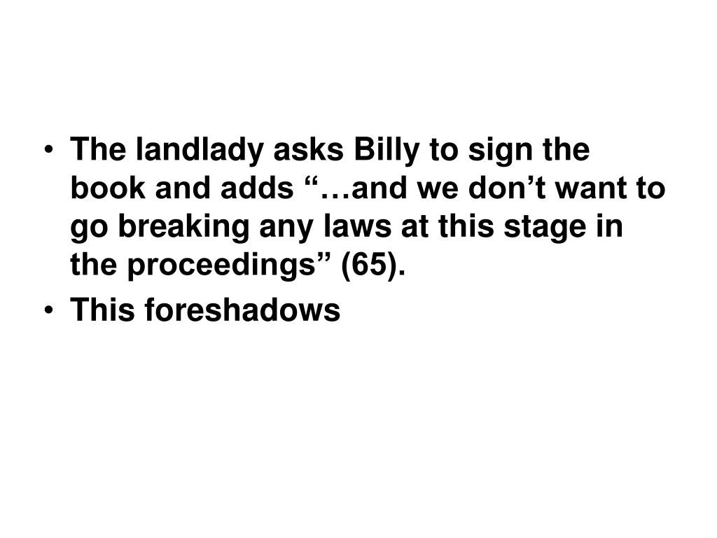 The landlady asks Billy to sign the book and adds “…and we don’t want to go breaking any laws at this stage in the proceedings” (65). • This foreshadows