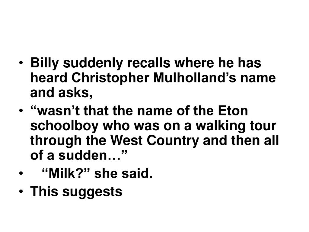 Billy suddenly recalls where he has heard Christopher Mulholland’s name and asks, • “wasn’t that the name of the Eton schoolboy who was on a walking tour through the West Country and then all of a sudden…” • “Milk?” she said. • This suggests