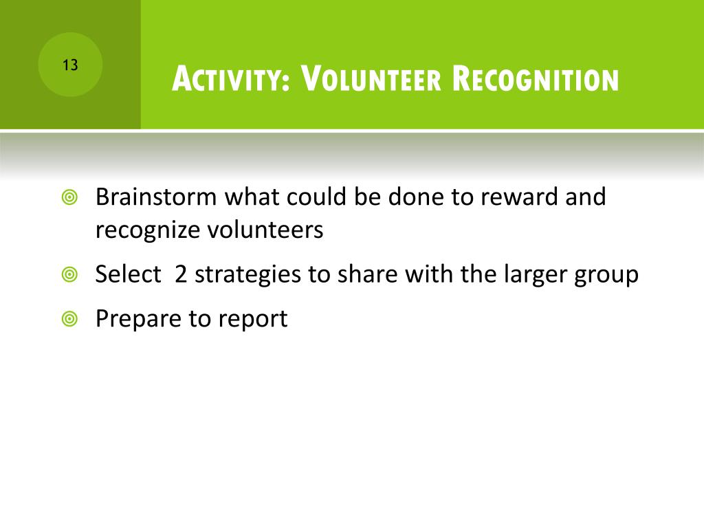 Activity: Volunteer Recognition • Brainstorm what could be done to reward and recognize volunteers • Select 2 strategies to share with the larger group • Prepare to report