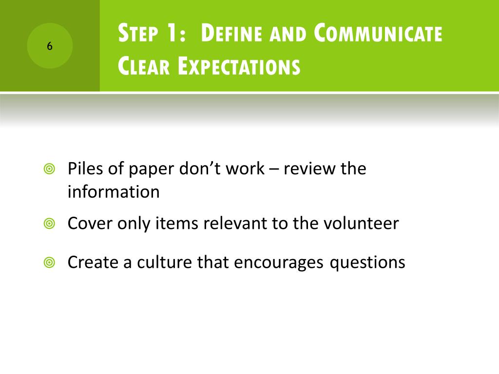 Step 1: Define and Communicate ClearExpectations Define & Communicate Clear Expectations • Piles of paper don’t work – review the information • Cover only items relevant to the volunteer • Create a culture that encouragesquestions