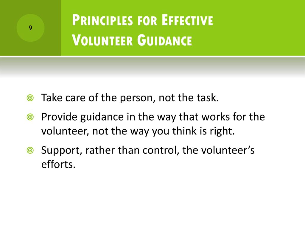 Principles for Effective Volunteer Guidance • Take care of the person, not the task. • Provide guidance in the way that works for the volunteer, not the way you think is right. • Support, rather than control, the volunteer’s efforts.