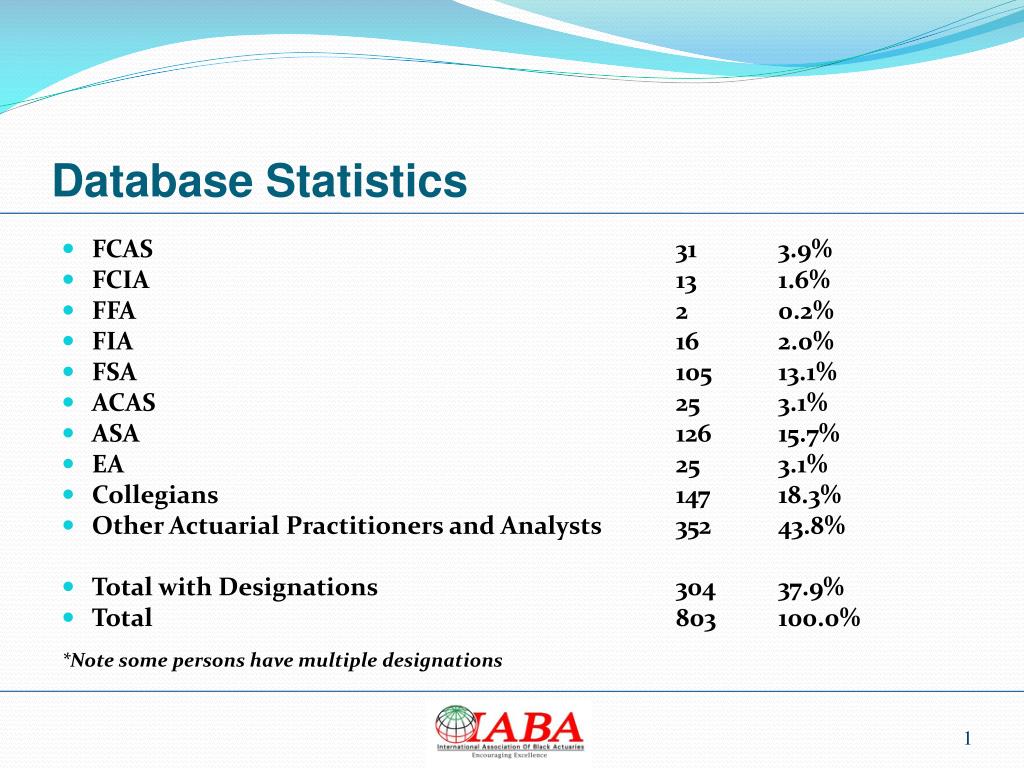 Database Statistics. FCAS 31 3.9% FCIA 13 1.6% FFA 2 0.2% FIA 16 2.0% FSA 105 13.1% ACAS 25 3.1% ASA 126 15.7% EA 25 3.1% Collegians 147 18.3% Other Actuarial Practitioners and Analysts 352 43.8% Total with Designations 304 37.9%
