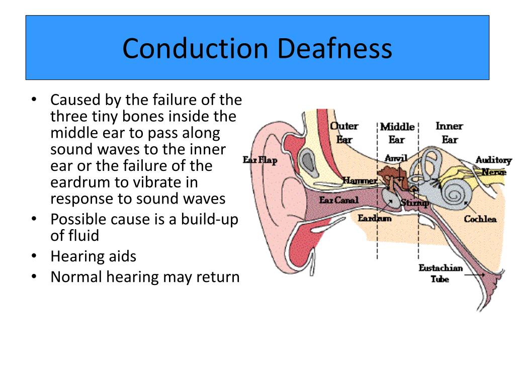 Conduction Deafness • Caused by the failure of the three tiny bones inside the middle ear to pass along sound waves to the inner ear or the failure of the eardrum to vibrate in response to sound waves • Possible cause is a build-up of fluid • Hearing aids • Normal hearing may return.