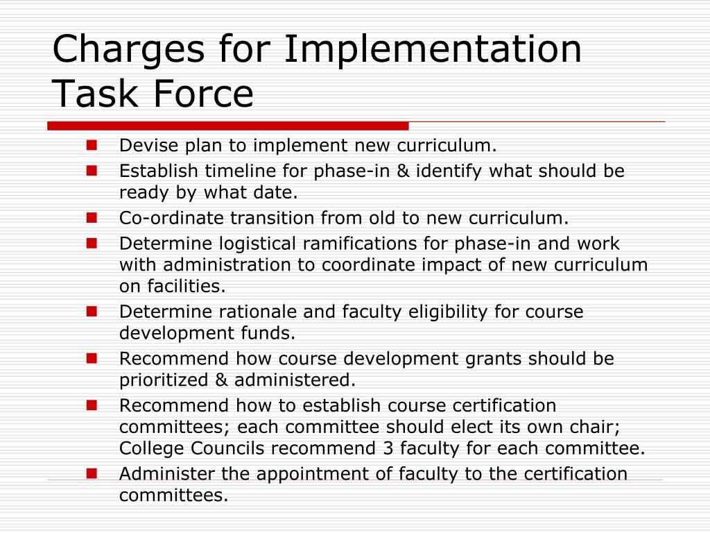 Charges for Implementation Task Force • Devise plan to implement new curriculum. • Establish timeline for phase-in & identify what should be ready by what date. • Co-ordinate transition from old to new curriculum. • Determine logistical ramifications for phase-in and work with administration to coordinate impact of new curriculum on facilities. • Determine rationale and faculty eligibility for course development funds. • Recommend how course development grants should be prioritized & administered. • Recommend how to establish course certification committees; each committee should elect its own chair; College Councils recommend 3 faculty for each committee. • Administer the appointment of faculty to the certification committees.