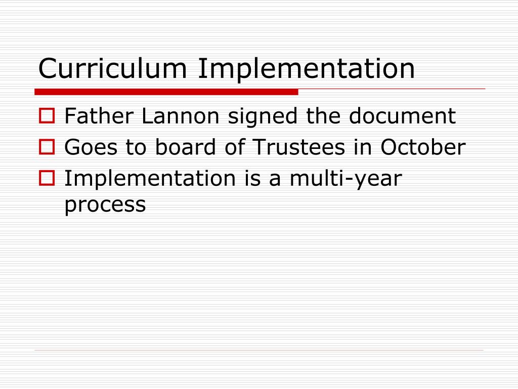 Curriculum Implementation • Father Lannon signed the document • Goes to board of Trustees in October • Implementation is a multi-year process