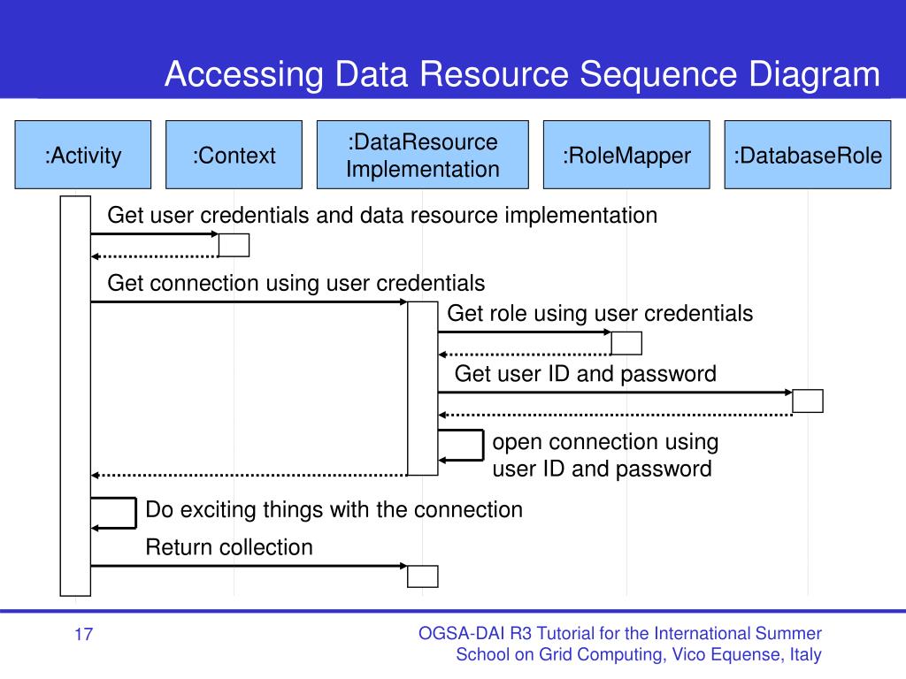 Accessing Data Resource Sequence Diagram :Activity :Context :DataResource Implementation :RoleMapper :DatabaseRole Get user credentials and data resource implementation Get connection using user credentials Get role using user credentials Get user ID and password open connection using user ID and password Do exciting things with the connection Return collection OGSA-DAI R3 Tutorial for the International Summer School on Grid Computing, Vico Equense, Italy