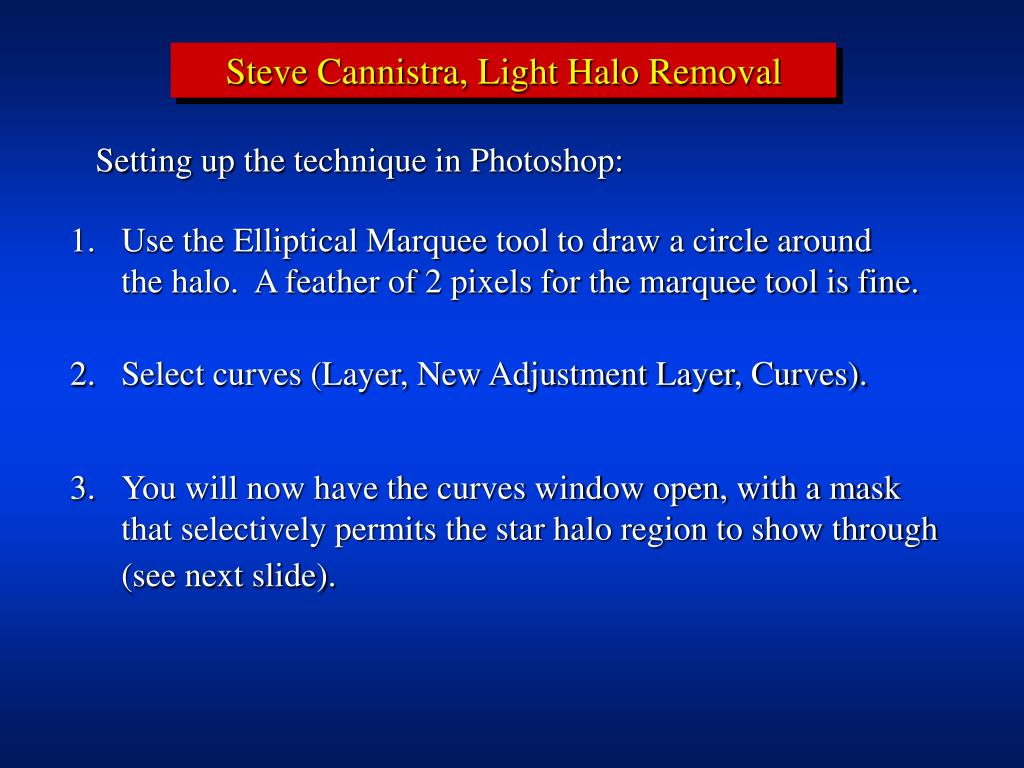 Steve Cannistra, Light Halo Removal. Light halos around stars can result from internal reflections. Steve Cannistra, Light Halo Removal. Setting up the technique in Photoshop:. 1. Use the Elliptical Marquee tool to draw a circle around