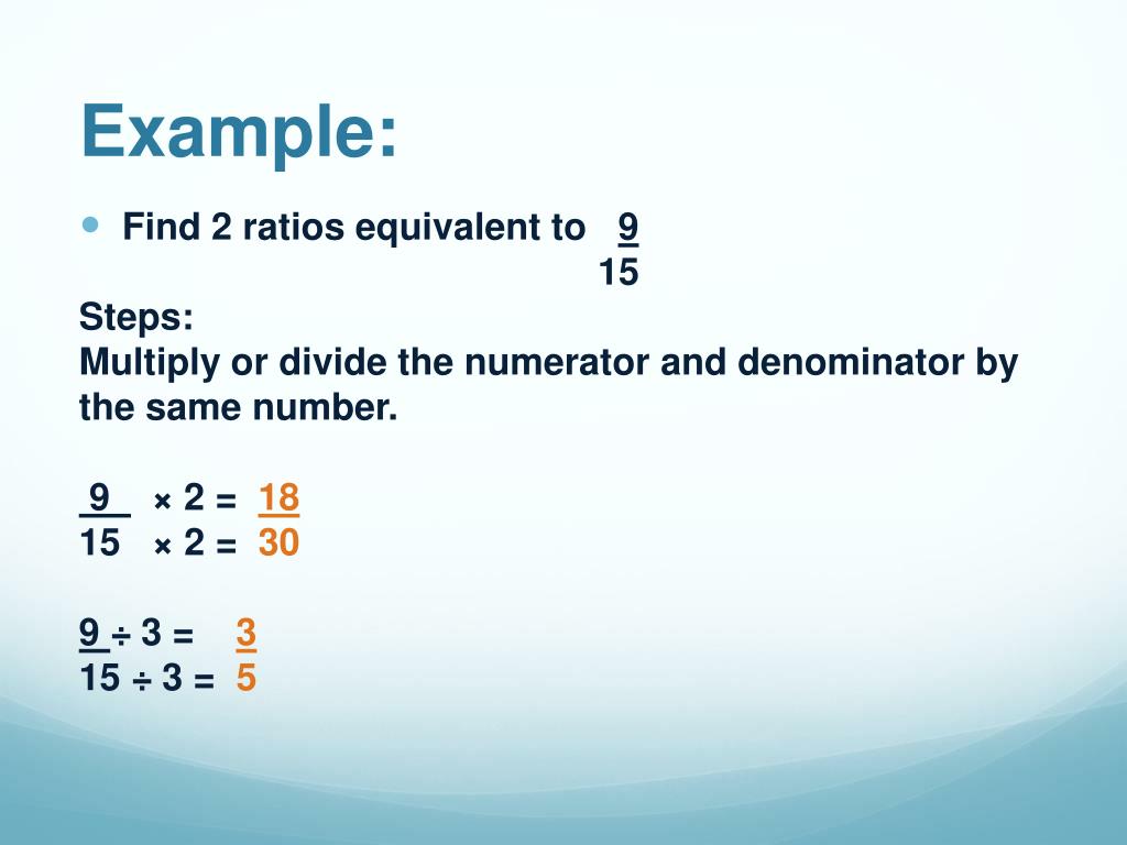 Example: • Find 2 ratios equivalent to 9 15 Steps: Multiply or divide the numerator and denominator by the same number. 9 × 2 = 18 15 × 2 = 30 9 ÷ 3 = 3 15 ÷ 3 = 5