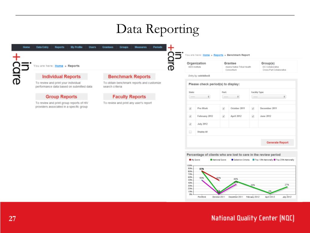 Campaign Database Allows participating agencies to self-report their performance data on this online application Individual agencies need to register to access the database Form a group of grantees, which would allow them to generate group reports, such as HIVQUAL regional groups, collaboratives, networks Immediate access to individual scores trended over time to regional/national benchmarking reports to reports based on common search criteria to group scores of established groupings Coaches have access to individual/groups scores to better assist participating agencies