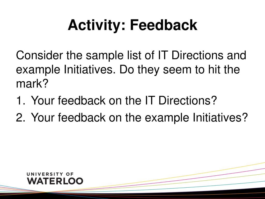 Activity: Feedback Consider what you have seen of federated models and governance. • What does it mean to have success in the way IT works together at Waterloo? • What would it take to get there?