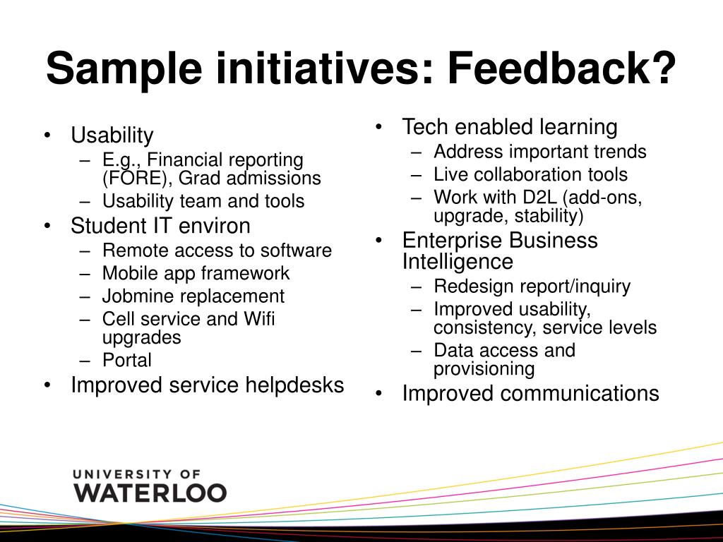 Sample initiatives: Feedback? • Usability • E.g., Financial reporting (FORE), Grad admissions • Usability team and tools • Student IT environ • Remote access to software • Mobile app framework • Jobmine replacement • Cell service and Wifi upgrades • Portal • Improved service helpdesks • Tech enabled learning • Address important trends • Live collaboration tools • Work with D2L (add-ons, upgrade, stability) • Enterprise Business Intelligence • Redesign report/inquiry • Improved usability, consistency, service levels • Data access and provisioning • Improved communications