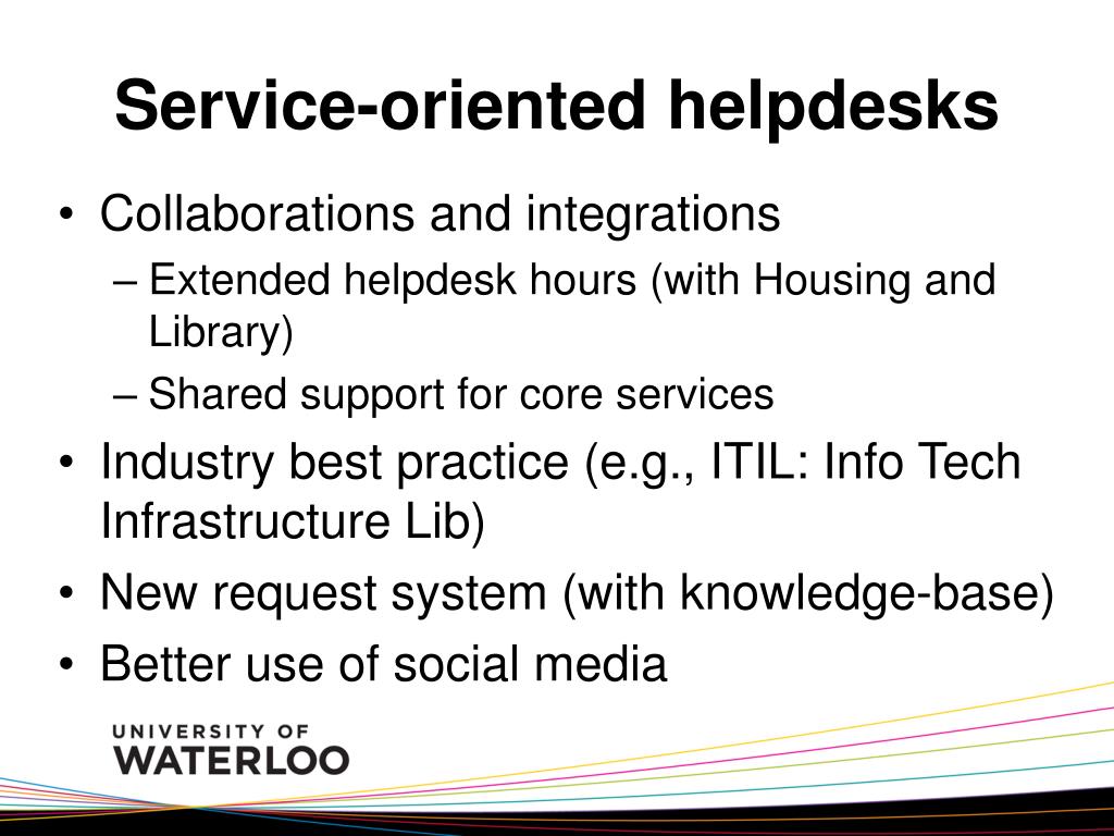 Service-oriented helpdesks • Collaborations and integrations • Extended helpdesk hours (with Housing and Library) • Shared support for core services • Industry best practice (e.g., ITIL: Info Tech Infrastructure Lib) • New request system (with knowledge-base) • Better use of social media