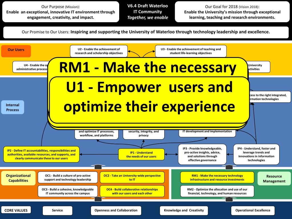 V6.4 Draft Waterloo IT CommunityTogether, we enable Our Purpose (Mission): Enable an exceptional, innovative IT environment through engagement, creativity, and impact. Our Goal for 2018 (Vision 2018): Enable the University’s mission through exceptional learning, teaching and research environments. Our Promise to Our Users: Inspiring and supporting the University of Waterloo through technology leadership and excellence. Our Users U2 - Enable the achievement of research and scholarship objectives U3 - Enable the achievement of teaching and student life-learning objectives RM1 - Make the necessary technology infrastructure and resource investments U1 - Empower users and optimize their experience OC4 - Build collaborative relationships with our users and each other OC2 - Take an University-wide perspective to IT IP2 - Define IT accountabilities, responsibilities and authorities, availableresources, and supports, and clearly communicate these to our users IP1 - Understand the needs of our users U4 - Enable the optimization of administrative processes across campuses U1 - Empower users and optimize their experience U5 - Enable University outreach activities IP11 - Be easy to do business with IP10 - Enable timely access to the right integrated, cutting-edge information technologies IP9 - Exchange high quality data and information when, where, and how it’s needed Internal Process IP8 - Maintain a secure, reliable, and useable information and technology environment IP5 - Continuously improve and optimize IT processes, workflow, and platforms IP6 - Ensure data security, integrity, and privacy IP7 - Take a structured approach to IT development and implementation IP3 - Provide knowledgeable, pro-active insights, advice, and solutions through effective governance IP4 - Understand, foster and leverage trends and innovations in information technologies IP2 - Define IT accountabilities, responsibilities and authorities, availableresources, and supports, and clearly communicate these to our users IP1 - Understand the needs of our users Organizational Capabilities OC1 - Build a culture of pro-active support and technology leadership OC2 - Take an University-wide perspective to IT RM1 - Make the necessary technology infrastructure and resource investments Resource Management OC3 - Build a cohesive, knowledgeable IT community across the campus OC4 - Build collaborative relationships with our users and each other RM2 - Optimize the allocation and use of our financial, technology, and human resources CORE VALUES Service Openness and Collaboration Knowledge and Creativity Operational Excellence