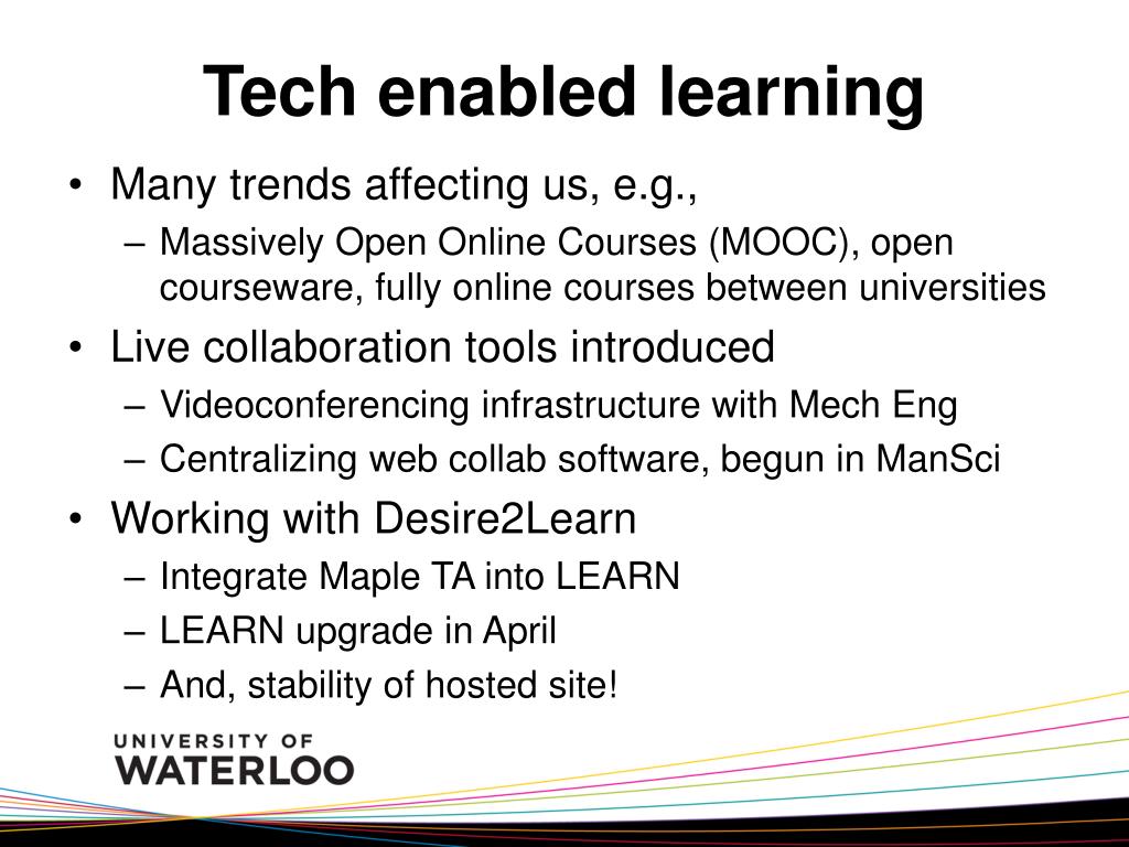 Tech enabled learning • Many trends affecting us, e.g., • Massively Open Online Courses (MOOC), open courseware, fully online courses between universities • Live collaboration tools introduced • Videoconferencing infrastructure with MechEng • Centralizing web collab software, begun in ManSci • Working with Desire2Learn • Integrate Maple TA into LEARN • LEARN upgrade in April • And, stability of hosted site!