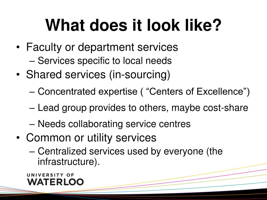 What does it look like? • Faculty or department services • Services specific to local needs • Shared services (in-sourcing) • Concentrated expertise ( “Centers of Excellence”) • Lead group provides to others, maybe cost-share • Needs collaborating service centres • Common or utility services • Centralized services used by everyone (the infrastructure).