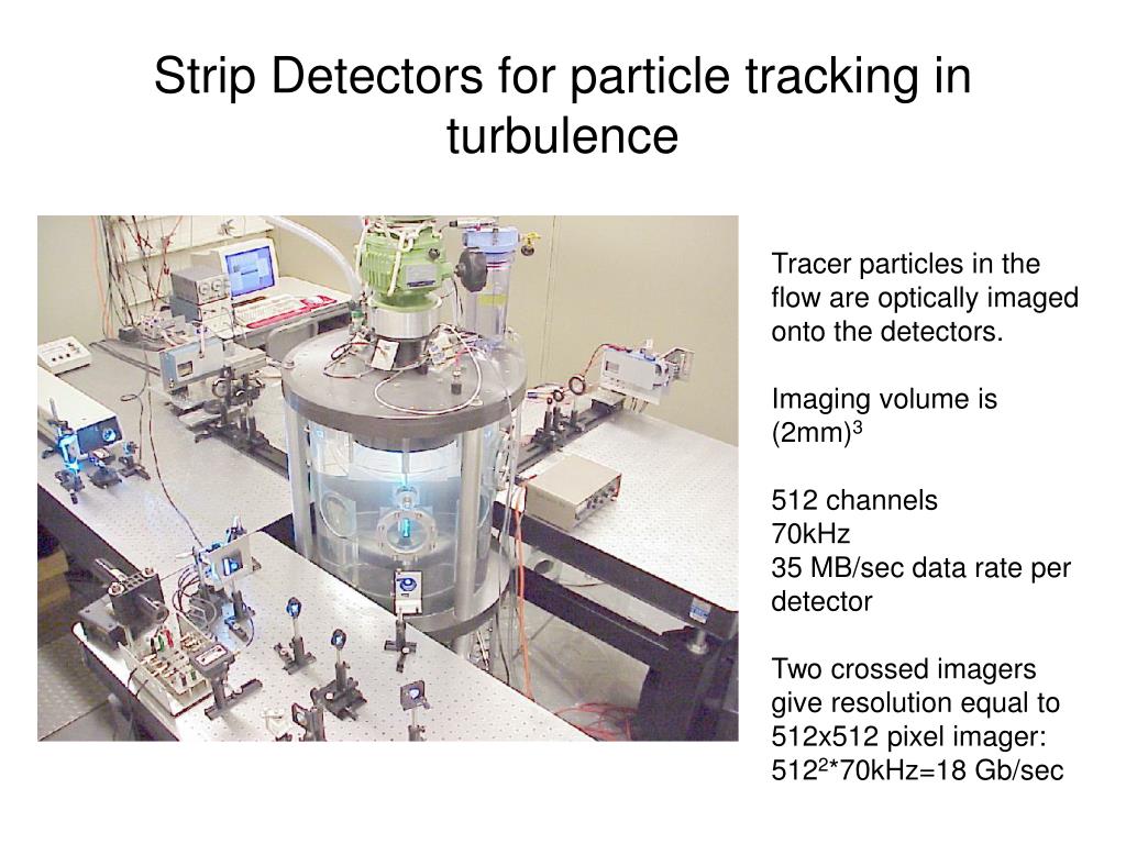 Strip Detectors for particle tracking in turbulence Tracer particles in the flow are optically imaged onto the detectors. Imaging volume is (2mm)3 512 channels 70kHz 35 MB/sec data rate per detector Two crossed imagers give resolution equal to 512x512 pixel imager: 5122*70kHz=18Gb/sec