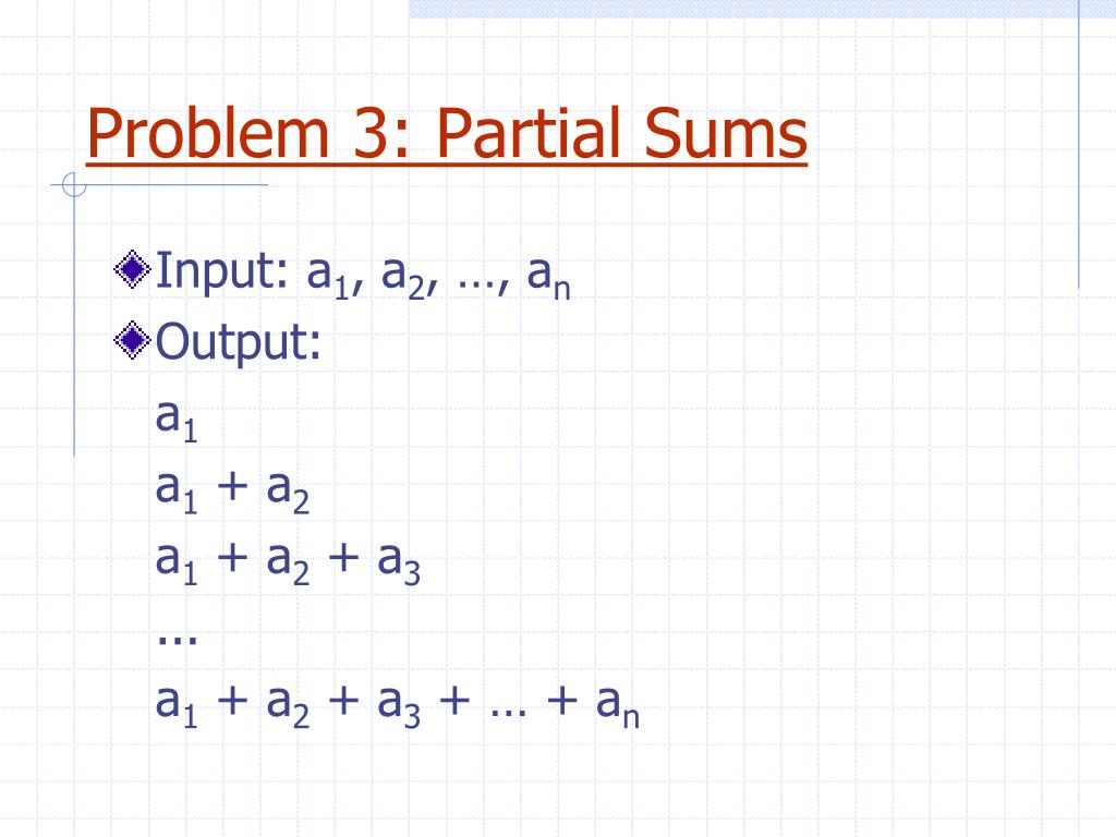Problem 3: Partial Sums • Input: a1, a2, …, an • Output: a1 a1 + a2 a1 + a2 + a3 ... a1 + a2 + a3 + … + an