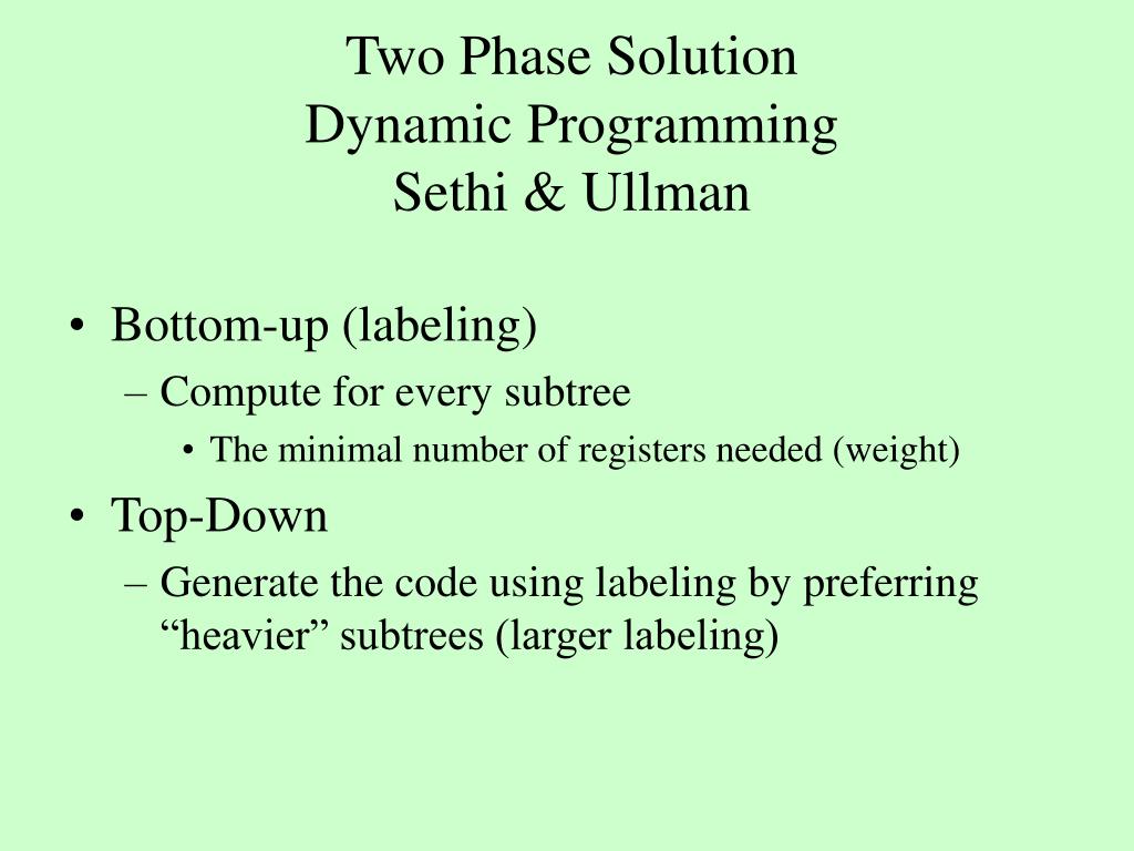 Register Allocation. Mooly Sagiv html://www.cs.tau.ac.il/~msagiv/courses/wcc04.html. Two Phase Solution Dynamic Programming Sethi & Ullman. Bottom-up (labeling) Compute for every subtree The minimal number of registers needed (weight) Top-Down