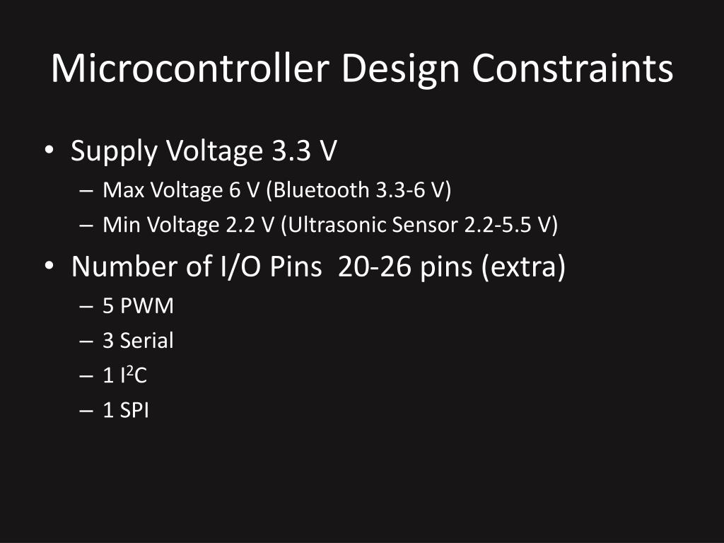 Microcontroller Design Constraints • Supply Voltage 3.3 V • Max Voltage 6 V (Bluetooth 3.3-6 V) • Min Voltage 2.2 V (Ultrasonic Sensor 2.2-5.5 V) • Number of I/O Pins 20-26 pins (extra) • 5 PWM • 3 Serial • 1 I2C • 1 SPI