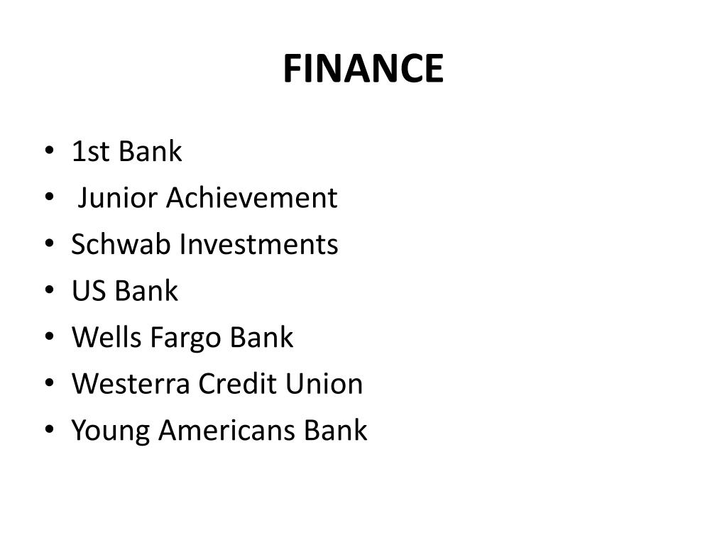 FINANCE • 1st Bank • Junior Achievement • Schwab Investments • US Bank • Wells Fargo Bank • WesterraCredit Union • Young Americans Bank