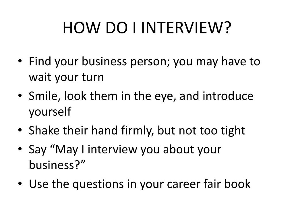 HOW DO I INTERVIEW? • Find your business person; you may have to wait your turn • Smile, look them in the eye, and introduce yourself • Shake their hand firmly, but not too tight • Say “May I interview you about your business?” • Use the questions in your career fair book