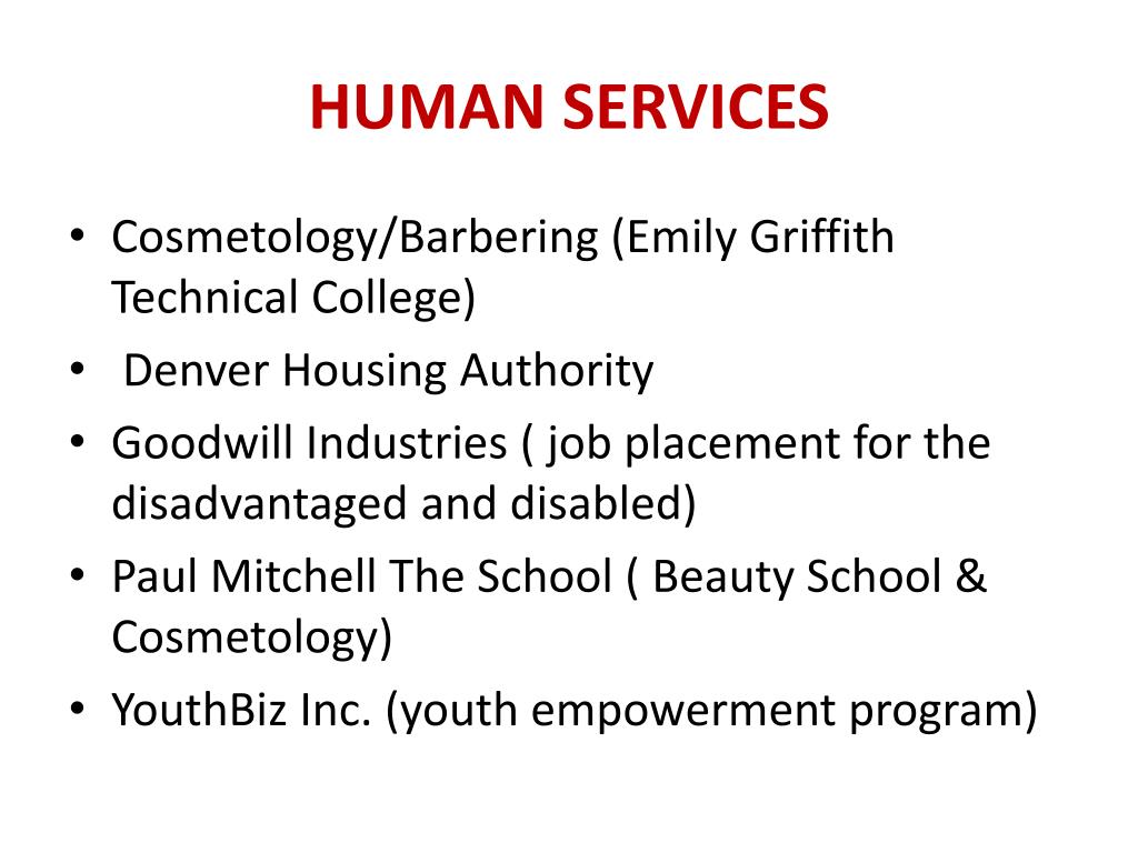 HUMAN SERVICES • Cosmetology/Barbering (Emily Griffith Technical College) • Denver Housing Authority • Goodwill Industries ( job placement for the disadvantaged and disabled) • Paul Mitchell The School ( Beauty School & Cosmetology) • YouthBizInc. (youth empowerment program)