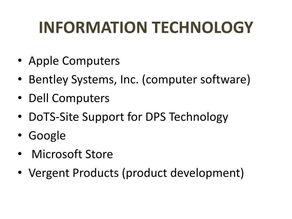 INFORMATION TECHNOLOGY • Apple Computers • Bentley Systems, Inc. (computer software) • Dell Computers • DoTS-Site Support for DPS Technology • Google • Microsoft Store • VergentProducts (product development)
